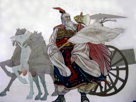 西伯(文王)去世後,太公輔佐[fǔ zuǒ]其子武王繼續文王未竟的滅商大業,被尊為“師尚父”。軍隊出發時,太公左手拿著黃金裝飾的大斧,右手緊握用白犛牛尾裝飾的軍旗發布號令。平定商紂後,太公成為第一位獲封的功臣謀士,封地在營丘(今山東省淄博[zī